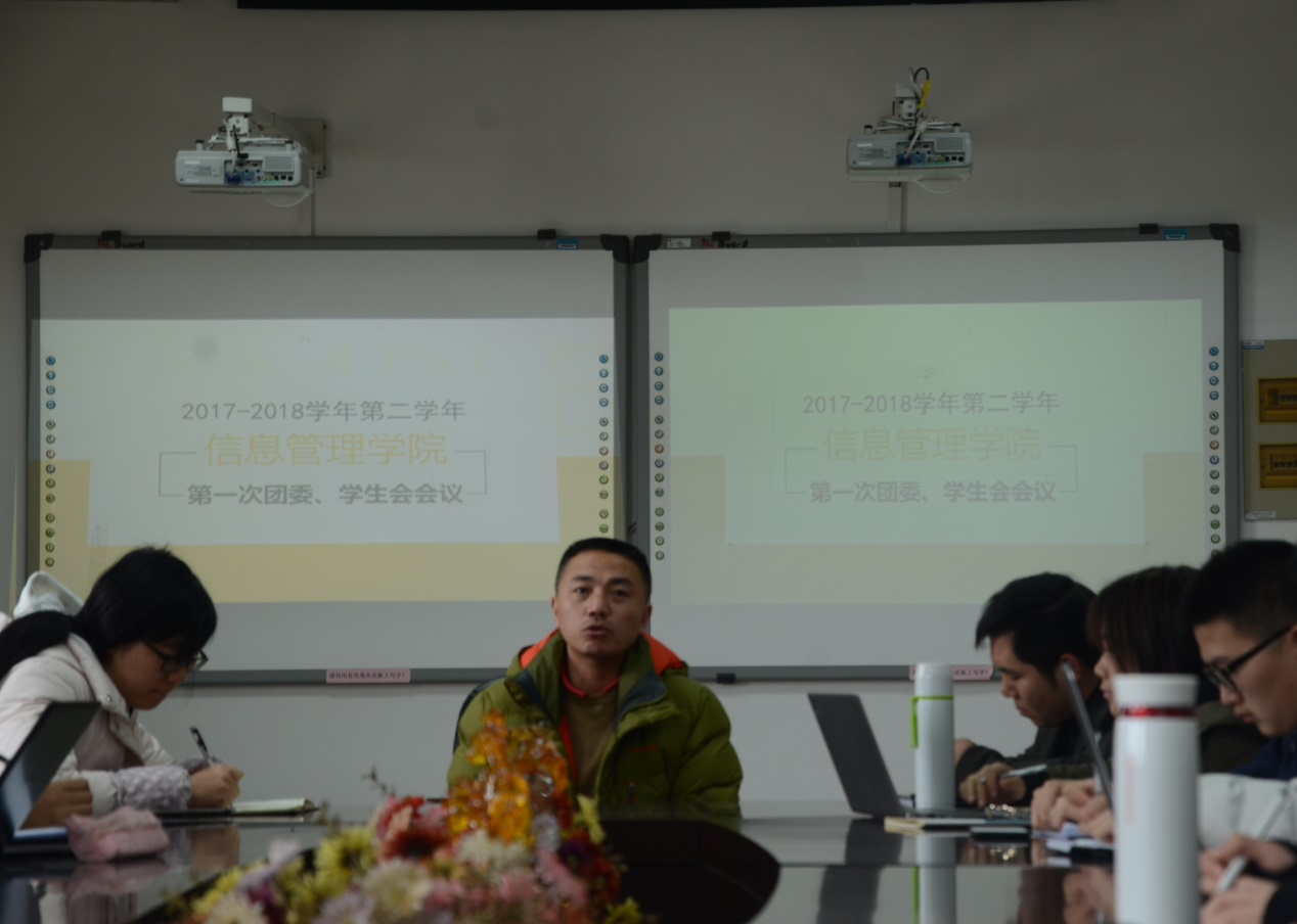 (通讯员 李乐平 郭致怡) 2018年3月8日中午12:00,信息管理学院团委学生会,2017-2018学年第二学期第一次集体会议,于九号楼918会议室召开。出席本次会议的嘉宾有:信息管理学院分党委副书记杨青松,团委书记蒋可鸣,辅导员范曜晖和穆帆老师,以及团委学生会成员,2015级、2016级年级干部。此次会议由秘书长米慧馨主持。