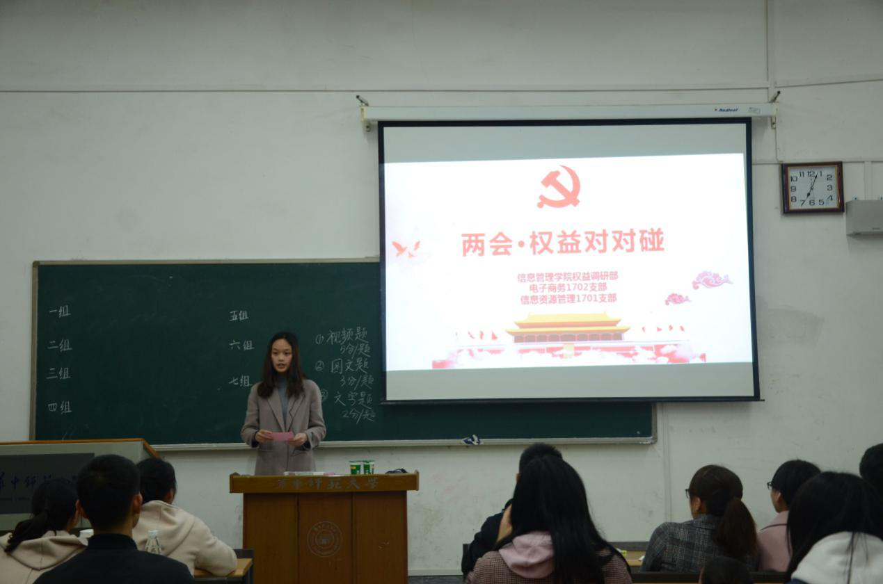 (通讯员 陈茗)为加深青年团员对“两会”的认识,增强全民维权意识, 3月16日晚,由共青团华中师范大学信息管理学院委员会主办、信息管理学院权益调研部、组织部联合承办了“两会•权益对对碰”主题团日活动。信息管理学院学院团委书记蒋可鸣、17级辅导员范曜晖出席本次活动。电子商务1702团支部、信息资源管理1701团支部共同参与本次活动。此次活动于八号教学楼8108教室举行,由付婧主持。