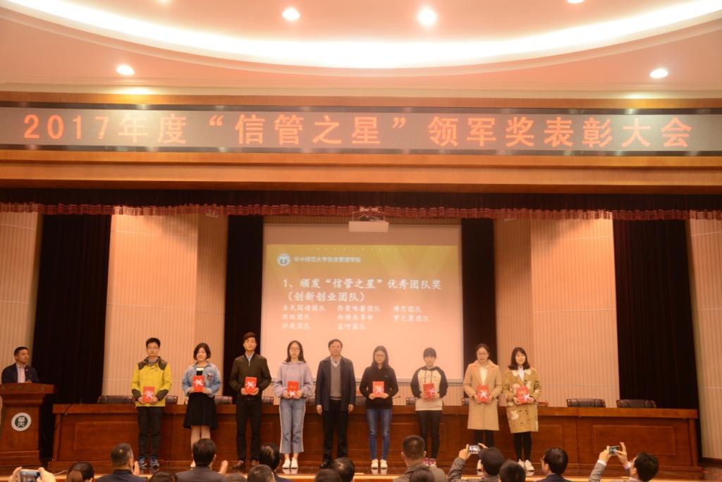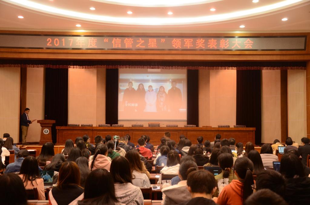 (通讯员 陈心雨 谢双蔓)3月25日下午,信息管理学院2017年度“信管之星”领军奖表彰大会在科学会堂举行。“信管之星”领军奖奖学金自2014年设立以来,学院自筹经费18万元,先后有58个团队和119名个人受到表彰和奖励。校党委副书记覃红,研究生工作部部长马海波,国内合作与校友办公室主任王志彬,学生工作部副部长王东爽,学工部资助中心鲍新龙,校团委副书记张慧智,信息管理学院领导班子,2006届校友武汉鑫九鼎房地产总经理高津津莅临了本次表彰大会现场。大会由学院分党委副书记杨青松主持,我院教师易明、董庆兴、池毛毛、陈静、陈慧、杨小溪、刘刚、刘向、王光超、张珺、叶光辉、李静、蒋可鸣、穆帆等老师也出席了此次表彰大会。