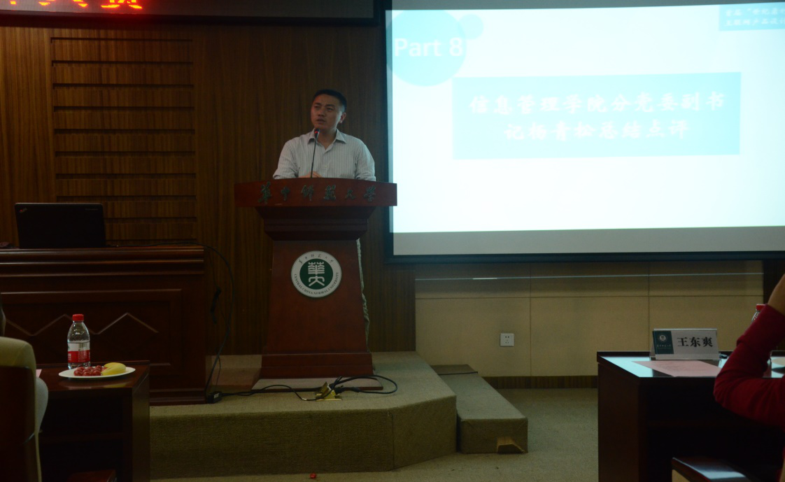 在八个团队展示完毕后,信息管理学院分党委副书记杨青松对本次比赛进行简要总结。他肯定了参与比赛的成员们出彩的创意和“初生牛犊不怕虎”的拼劲和冲劲,但同时指出大家仍有很大的进步空间,需要更多的锻炼和专业的训练,他鼓励更多有想法的同学勇于尝试,最终将自己的想法付诸实践。