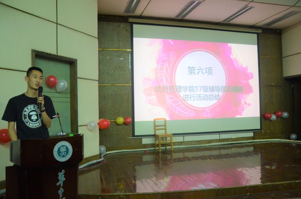范耀晖对本次比赛进行总结,他首先高度肯定大家的展示成果。表示一年来的种种都是美好的回忆,同学们积极、乐观、团结、创新的精神感染着自己。刚好正值五四青年节之际,他结合学习、学生工作、志愿服务、自身修养等四个方面,表达了对17级成员的鼓励与希冀。希望同学们在今后的日子,厚积薄发天天向上。