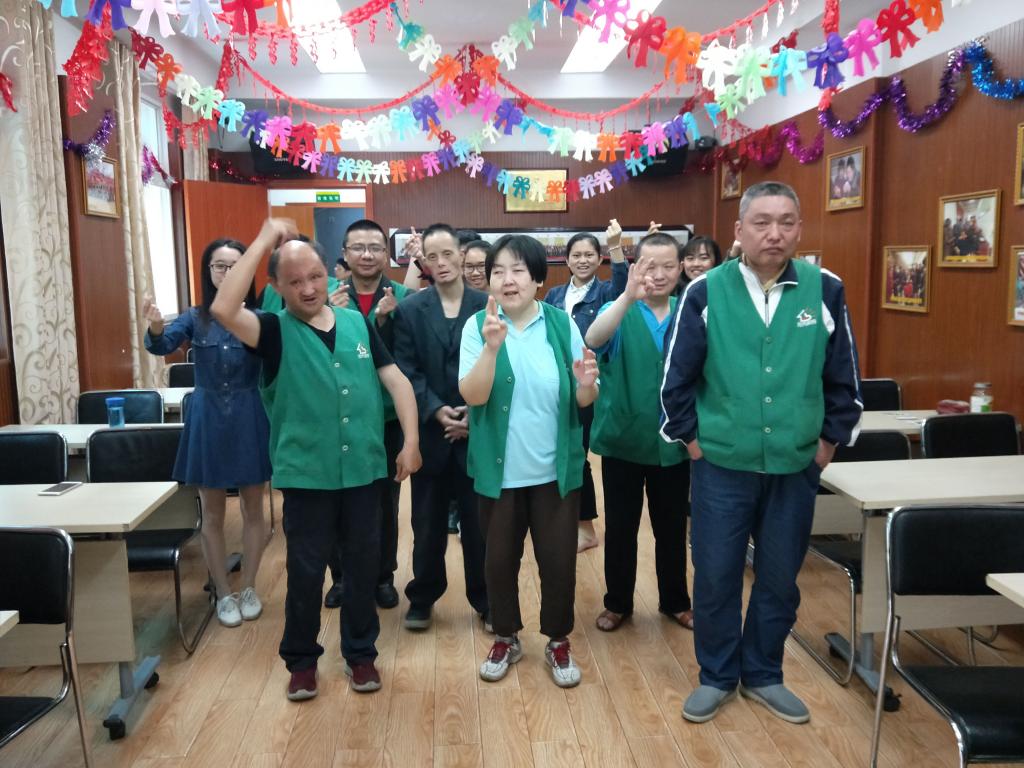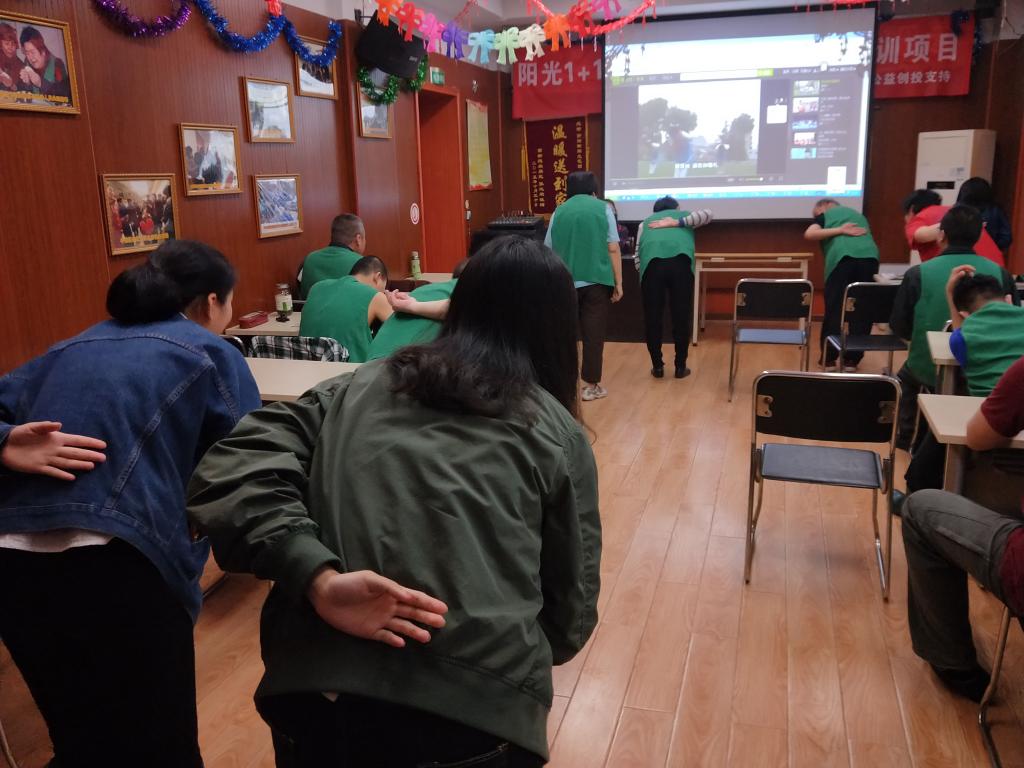 将近9:30,志愿者们抵达了紫阳街阳光家园。因天气原因,残疾人朋友们在教室里做着早操。大家一起跟着音乐灵活舒展,他们动作整齐,他们精神抖擞,他们踏着富有节奏的音乐快乐的摆着、跳着。