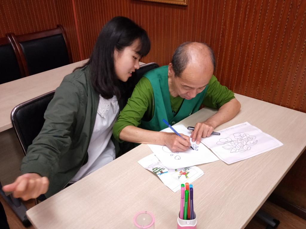 接着,是简笔画教学。残疾朋友们在志愿者的指导下认真地画了起来。每位志愿者陪伴在一位服务对象旁边,耐心地指导着他们的绘画作品,他们的作品充满了对这个世界的想象力,他们不受世俗的约束,能够画出自己心中最美的图画。他们或许并没有高深的绘画功底,但是他们的认真让人动容。