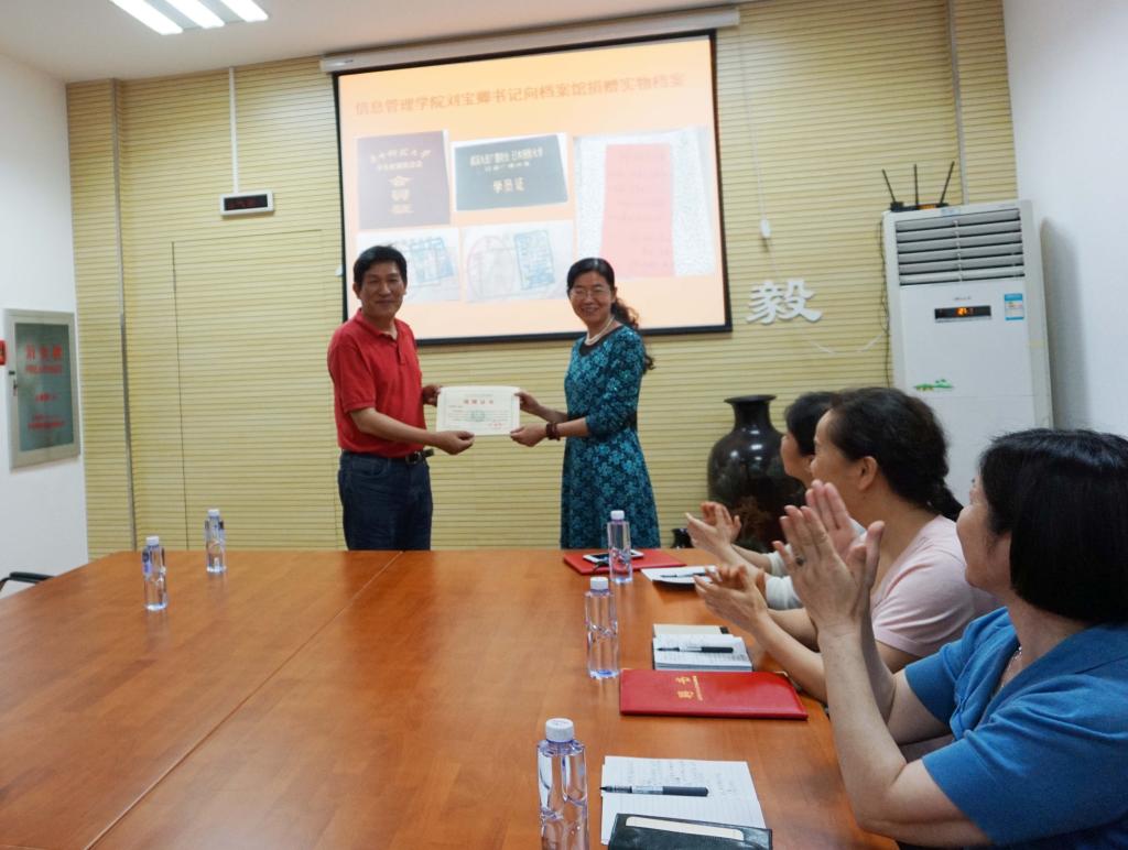 随后,艾咏芳副馆长为信息管理学院刘宝卿书记颁发捐赠证书,感谢他给档案馆捐赠的学校早期社团会员证、洗澡票等珍贵实物档案。
