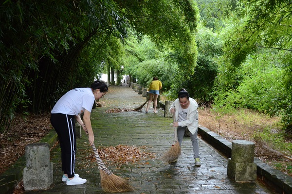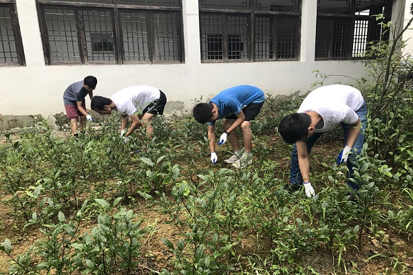 队员们分为两组,一组负责清扫庭院,一组负责拔除园中杂草。由于刚刚下过雨,庭院中飘散的落叶黏在土地上,为清扫工作增加了难度片刻的劳动就使每个人汗流浃背。