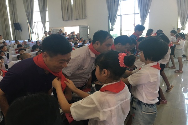 在现场领导及来宾到场就坐后活动正式开始,五年级同学以少先队队歌顺利开场,同学们歌声洪亮,积极阳光,通过歌曲唱出少先队员的光荣感和组织归属感。队员们整齐按序走到台下,为到场来宾献上红领巾。