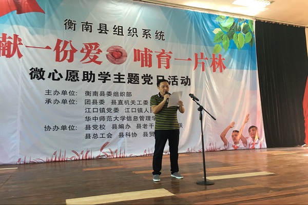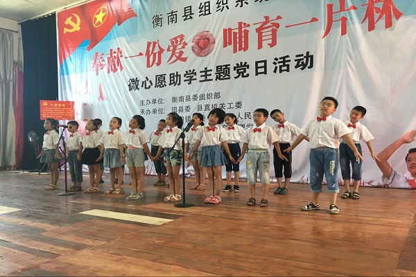 (通讯员:韦岳良)7月16日早,中共衡南县直属机关工作委员会、共青团衡南县委“奉献一份爱·哺育一片林”微心愿助学活动暨华中师范大学信息管理学院追光实践队江口镇中心小学文艺汇报演出在衡南江口镇政府礼堂举行。县委常委、统战部长倪美平、县党委组织部副部长谢小平、江口镇党委书记阳宏辉、江口镇中心小学校长罗晖、华中师范大学信息管理学院团委书记蒋可鸣、江口镇中心小学暑期班学生以及华中师范大学信息管理学院追光实践队衡南分队全体队员出席本次活动,活动由追光实践队衡南分队队员吴婷、杨金长主持。