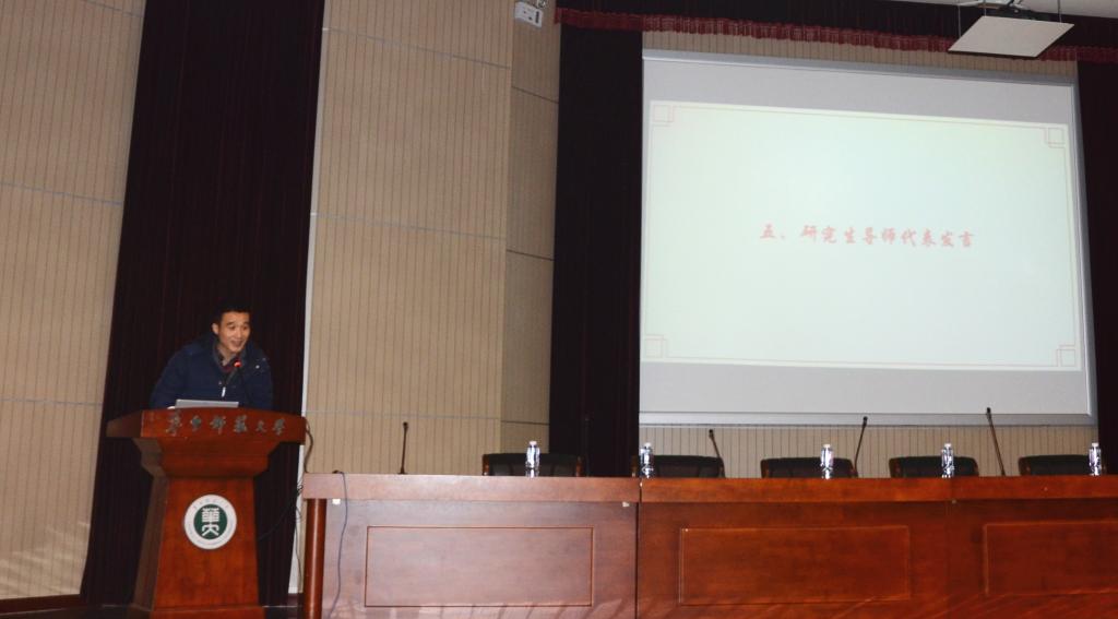 大会伊始,全体人员肃然起立,奏唱了《中华人民共和国国歌》,使得心中的豪迈之情与庄严之感顿时油然而生。首先发表讲话的是研究生院工作部副部长徐刚,徐部长从国家、学校、学院等多重层次逐一解读了当代研究生培养的方向和目标,同时对宏观层面上的研究生工作进行了部署和展望,使我们在格局和眼界上变得更加辽阔、深远。