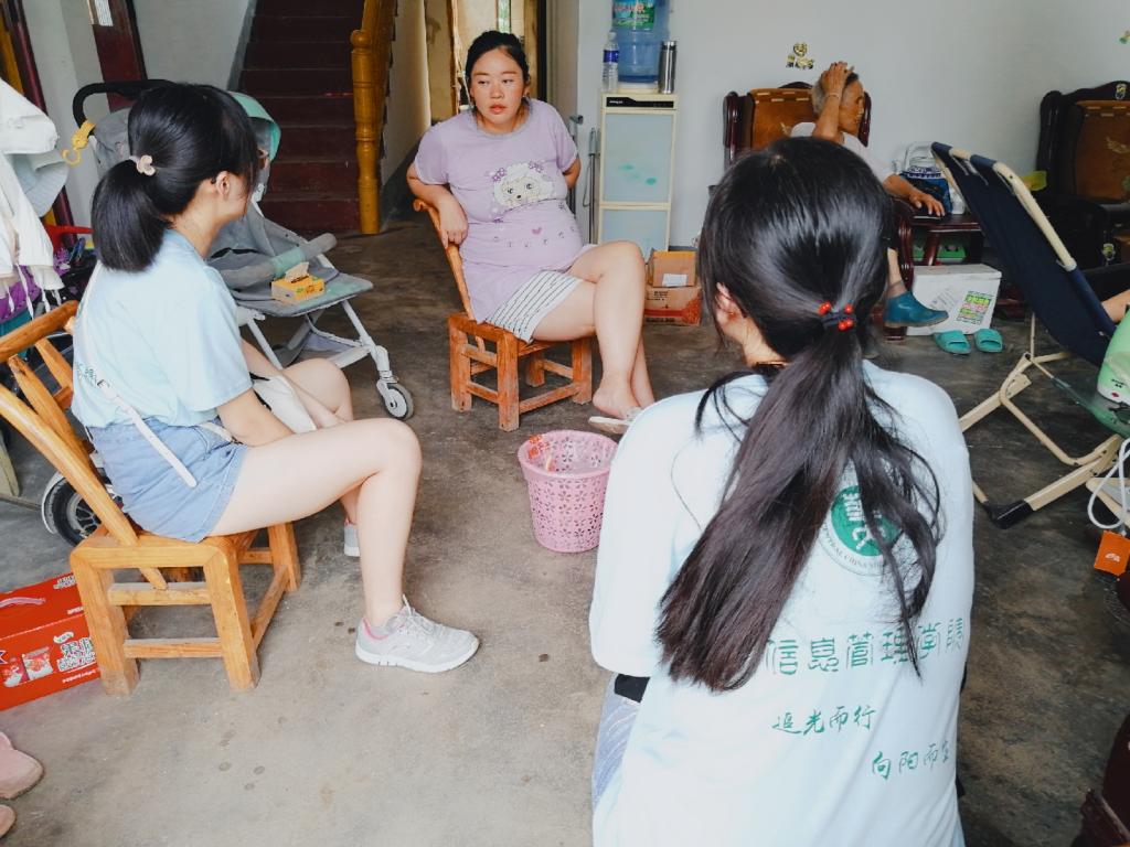 在教学活动前期,一位女生的文静内向、腼腆害羞逐渐吸引了队员们的目光。经过几天的相处,队员们了解到,这位女生名叫佳佳,她不仅是一名留守儿童,而且父母已离异。7月18日下午,伴着热气尚未消散的日光,三名队员一同前往佳佳的家,进行家访。