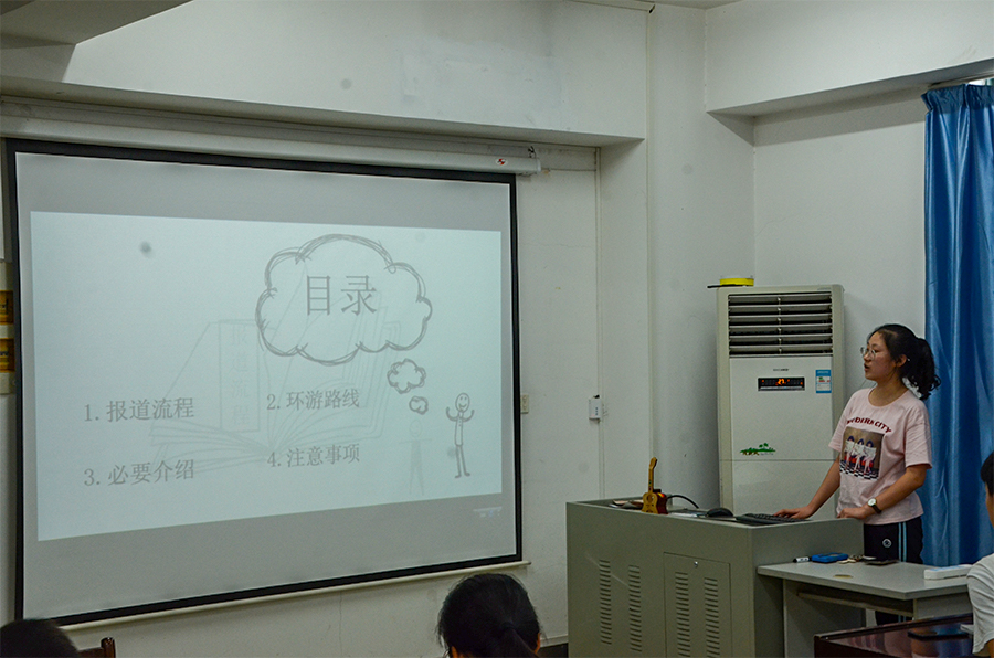 徐凤晨随后对新生志愿者进行系统培训。她分别对新生报道流程、学校环游路线、财产和人身安全问题进行详细介绍,并对水电缴纳、一卡通充值等一些必要物品的使用细节进行提醒和强调。