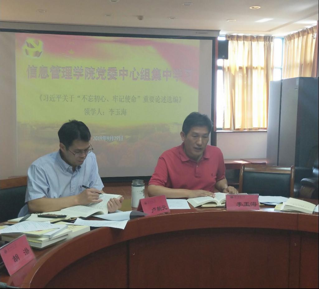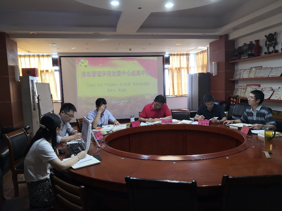 根据校党委的要求和信息管理学院分党委的工作安排,2019年9月29日上午,学院党委中心组成员在九号楼921会议室进行了“不忘初心,牢记使命”主题教育第一次集中“领学”。本次会议由院长李玉海主持学习并“领学”,学院领导班子等成员参加了本次学习。