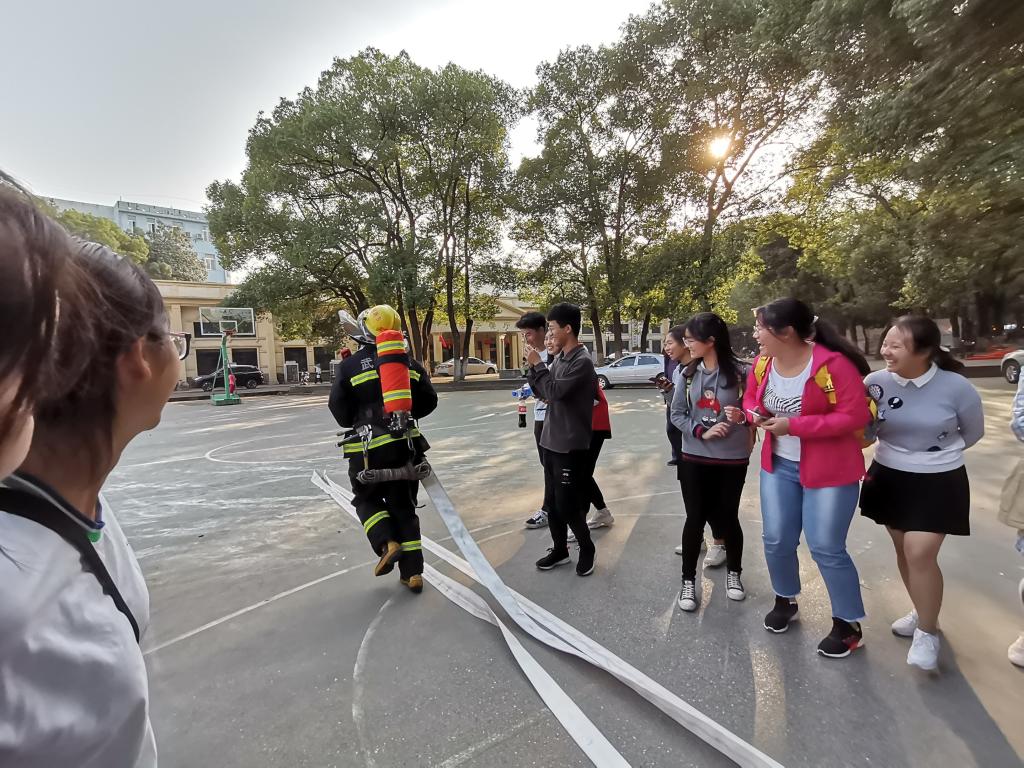 同时,为增进同学们对消防员工作的了解,授课人员准备了消防员出警时的全套装备,现场穿戴以便让同学们知道每一个部件的具体功能,并且邀请同学也穿上消防员“战衣”进行亲身体验。在演习的最后,教官还邀请全体参训人员进行灭火实操。全体同学积极参与,这样难得的实践机会让从前对防火知识仅停留在理论上的同学们受益匪浅。
