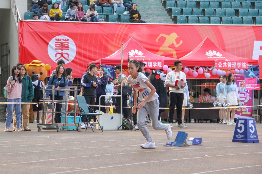 终于,万众期待的女子组400米第六组比赛开始,信息管理学院文若星站在检录处准备起跑。枪声落地,文若星似离弦之箭向前冲去,迅速超越了周围选手,从前期便建立了领先优势。比赛过程中,她咬紧牙关,没有半点松懈。在最后的冲刺阶段,她以顽强的毅力,坚持加速向终点奔跑,以自身的实力拉开了其他选手一大段距离,率先冲线。跑道边的同学们激动地为她加油呐喊,最终,文若星拿下了小组第一、总体第三的好成绩,等在终点的同学们都为之而欢呼雀跃。