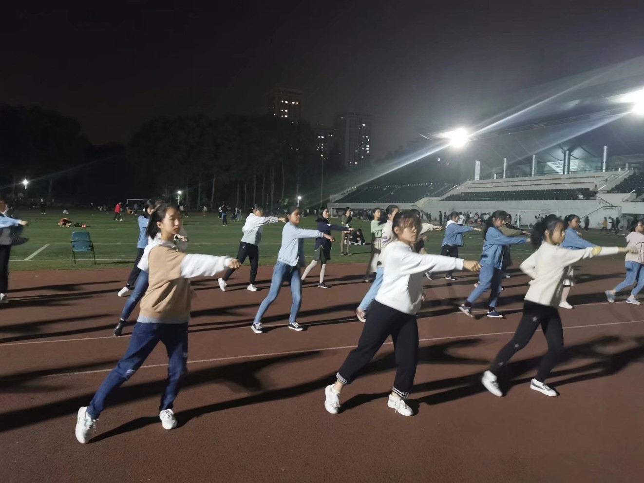 比赛开始前几周,我院体育部组织全体女生周一、周二和周四晚上在佑铭体育场进行训练。因我院女生人数众多,给训练增加了难度,但是在教练和同学们的不懈努力下,训练有条不紊的开展。在训练初期,教练会指出每一个动作的要领,确保每一位同学无错误。虽然每天训练到很晚,但是同学们不叫苦不叫累,坚持保质保量完成训练内容。单节训练结束后,随之开展的是综合训练:将四个单独阶段连接起来训练。一开始很多同学动作不连贯,经常会出现中间断层的情况。但是在经过两天的训练后,同学们各方面都有了明显进步。随后训练进入新的阶段,这个阶段,同学们主要是训练节奏感,将动作与乐点结合起来。在此期间,教练对学生进行了筛选,通过分组比赛的方式,最终选出四十名同学参加团体操比赛。选拔出参赛人员后,新一轮训练很快就紧锣密鼓的展开了。最终,在教练和同学们的共同努力下,我们团体操取得了二等奖的好成绩。