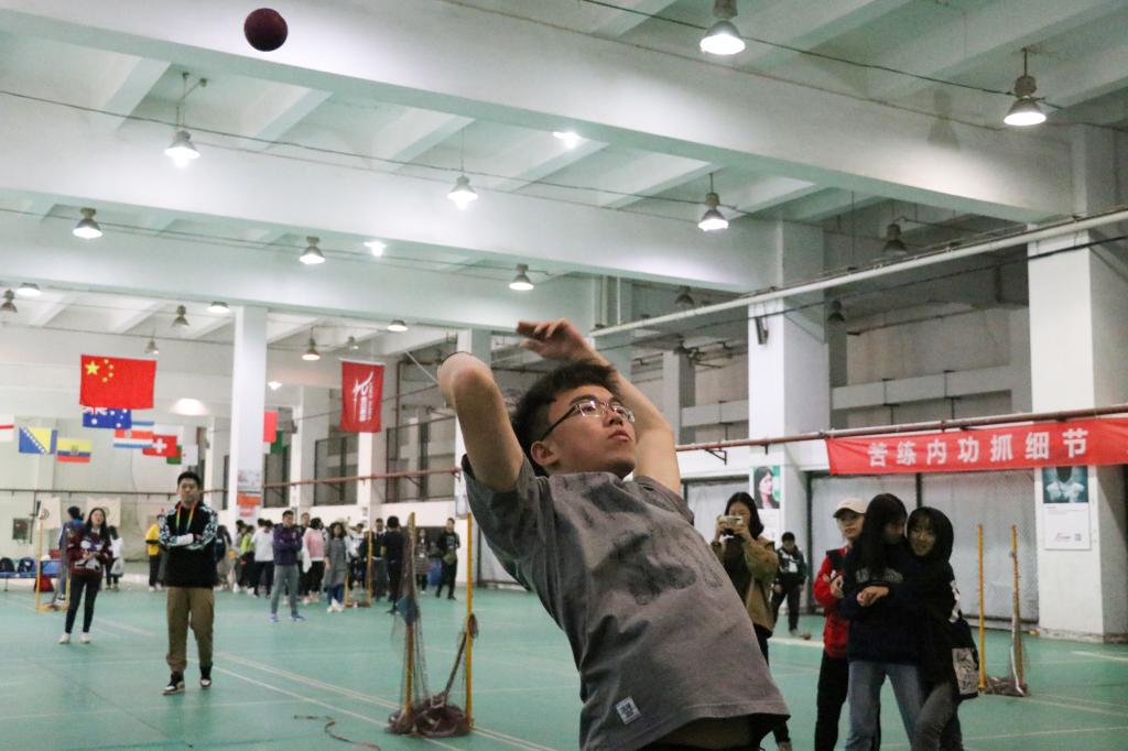 比赛开始,由信息管理学院女将打头阵,她们个个满怀必胜的信念,拿出“谁说女子不如男”气势。男生紧随其后,以惊人的爆发力赢得场上的阵阵欢呼与喝彩。赛场上,信管选手们以团结的精神和不甘示弱的毅力尝试突破极限,个个表现出色。“双脚开立、双手持球、两腿下蹲、上身迅速抬起”,他们牢记动作要领,奋力抛球,一道道完美的弧线展现出了他们的实力。场上的阵阵欢呼雀跃是他们优秀的证明。