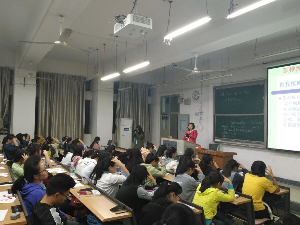 最后,徐老师还现场教授给同学们一些预防颈椎病的方法及技巧,例如防止头颈急性外伤、纠正不良姿势防止慢性劳损、选择适合的枕头、积极进行体育锻炼、在课余休息时间进行自我按摩等,同学们积极地跟着徐老师做预防保健操实践。