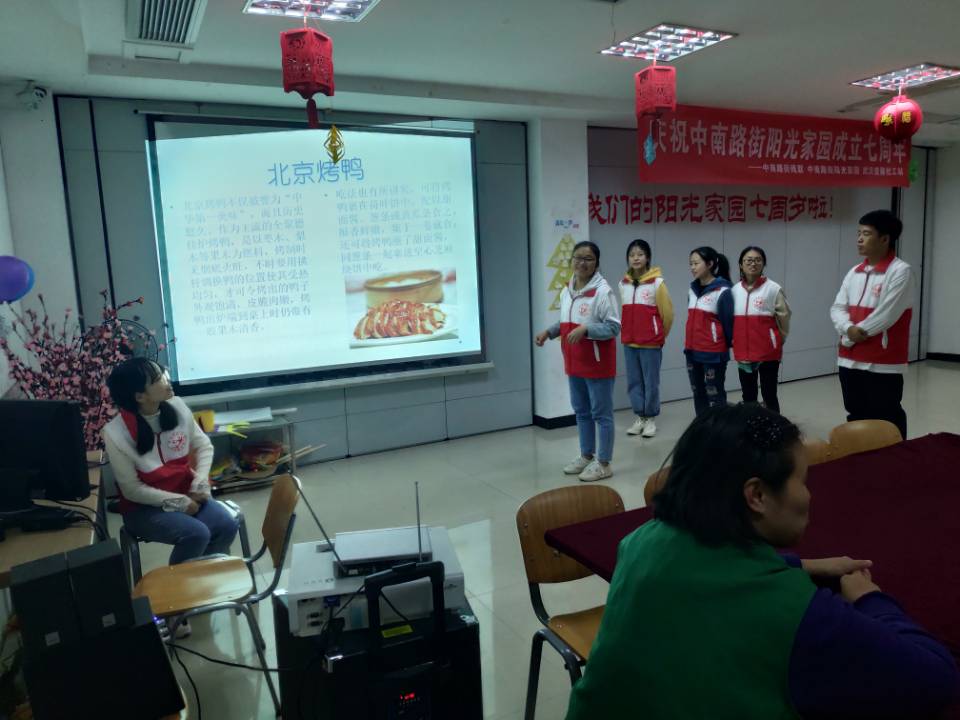 志愿者们到达中南路阳光家园,经过10分钟的准备后开始了今天的志愿服务内容。利用ppt,志愿者首先详细介绍了北京烤鸭、南翔小笼馒头、功德林素食、广东小凤饼、驴肉火烧等富有特色的美食,同时穿插着这些美食的图片,令残疾人朋友垂涎欲滴。