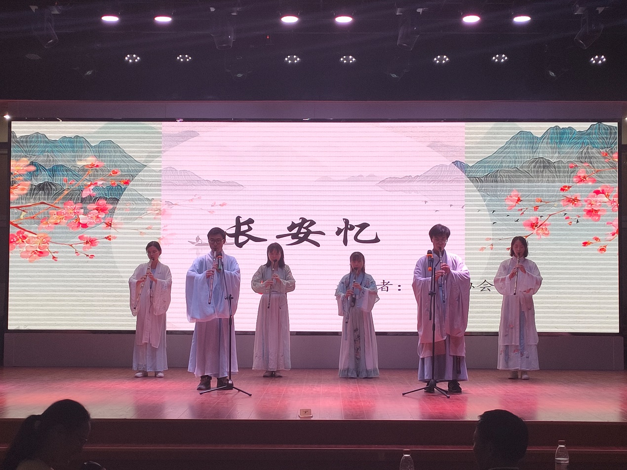 “和风伴月笛箫韵,似玉如兰博雅人”。萧是一种非常古老的吹奏乐器,历史悠久,音乐圆润轻柔,幽静典雅。今天,笛箫协会六位谦谦君子就为我们表演了精彩的《长安忆》,伴随着乐声,我们仿佛能看到盛世长安的盛衰兴亡和后人对长安盛世的无限追忆。他们用精湛的技艺将这首充满伤情和追忆的曲子表现得淋漓尽致。“长安雨,一夜落秋意”,曲已终,声未绝。观众们久久不能自拔,一时间掌声雷动。