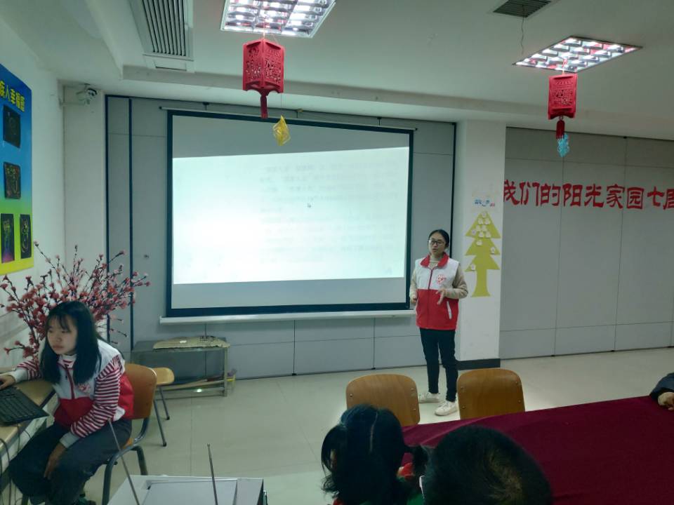 志愿者到达中南路阳光家园,经过十分钟的准备后,以文字、图片加视频形式,来介绍湖南牛肉米粉和剁椒鱼头的由来和制作过程,作为此次志愿服务活动的开端。接着志愿者又播放了摆手舞的视频,配上那富有节奏的音乐,以至于残疾人朋友坐在座位上便随着音乐舞动起来。接着有关舞火龙、醴陵釉下五彩、孟姜女的视频的播放,促进了残疾人朋友对湖南省非物质文化遗产相关知识的了解。