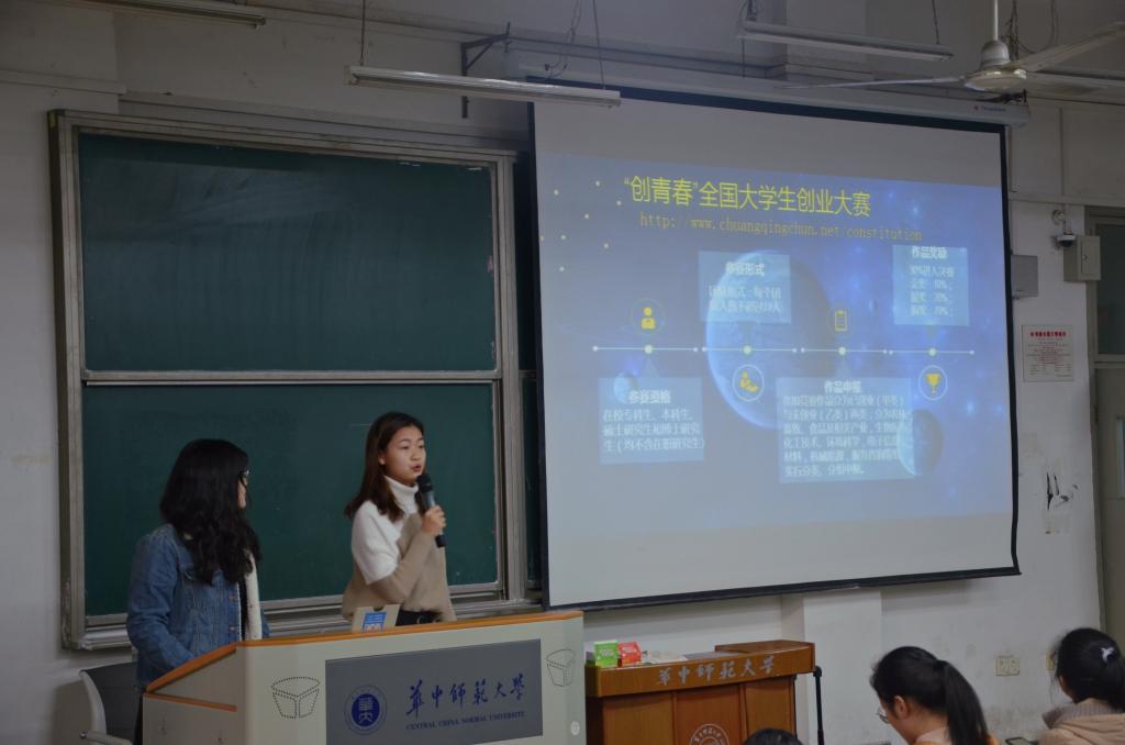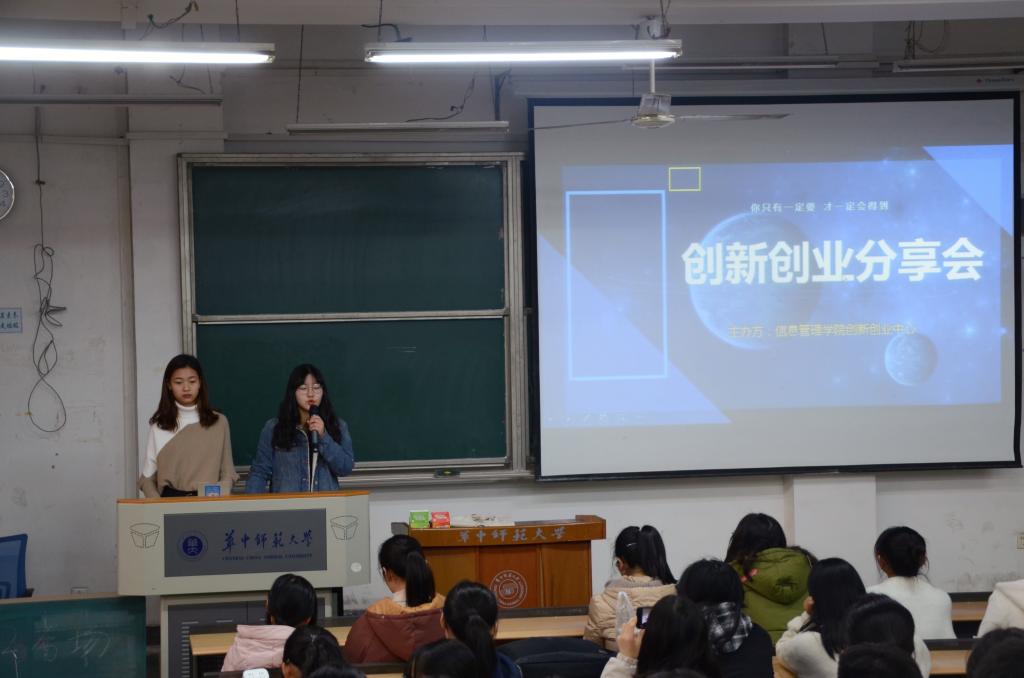 (通讯员 徐琳琳 詹佳宁)12月8日晚,信息管理学院创新创业分享会在八号楼8210举行。本次活动由信息管理学院创新创业中心主办,主讲人是部门干事陈清霞和李丹丹。本次分享会主要介绍了“挑战杯”、“创青春”、“互联网+”和“三创赛”等创新创业类比赛的概况,介绍了比赛参与的时间与条件,鼓励同学们积极参加比赛。