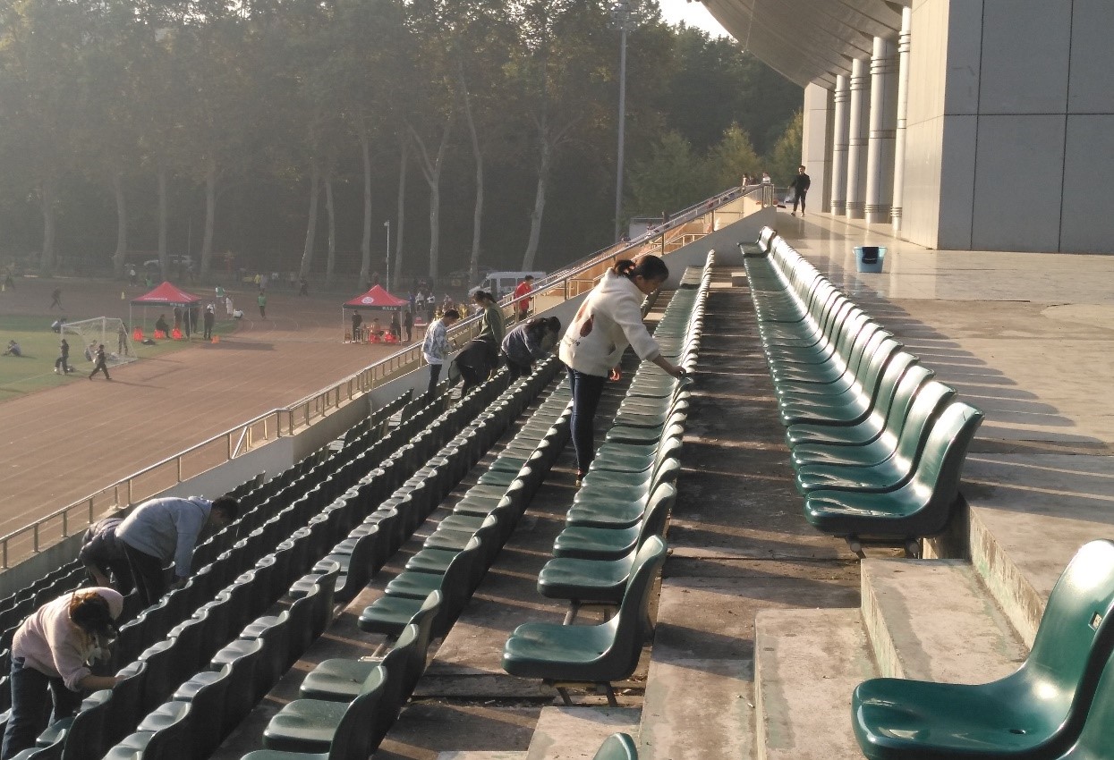 在清洁过程中,同学们分工合作,男女搭配,不仅将地面上的垃圾灰尘一并清扫,而且用自备的抹布把看台上的椅子一一擦拭干净。由于露天的缘故,看台上的椅子大多积灰较厚,在学校举办一些大型活动时,常常给前来观看的观众造成困扰。因此全体同学对自己所负责的清洁区域的椅子反复擦拭,来为大家提供舒适的体验。而本次志愿服务位置于体育场后侧,距离水源很远,同学们需要不断的更换水桶里洗过抹布的水,1904班的男同学不多,但在需要他们的时候总能积极担负起责任,在注意到水桶里的水变脏之后马上主动去提干净的水,大大提高了劳动效率。这样的志愿服务,锻炼的不仅是劳动能力,也更加锻铸了一个班集体的凝聚力。