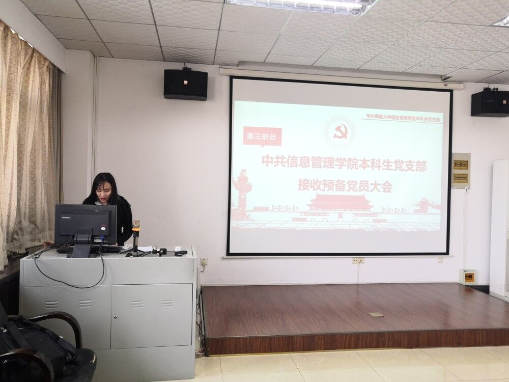 (通讯员 陈天雨 郝敬贞)2019年12月12日,中共华中师范大学信息管理学院本科生党支部预备党员接收大会在九号楼918会议室顺利召开。本次大会旨在吸纳优秀同志壮大党员队伍,为支部将来的发展打下坚实的基础。大会由党支部书记肖丽霞同志主持,支部本科生党员和发展对象参加会议。