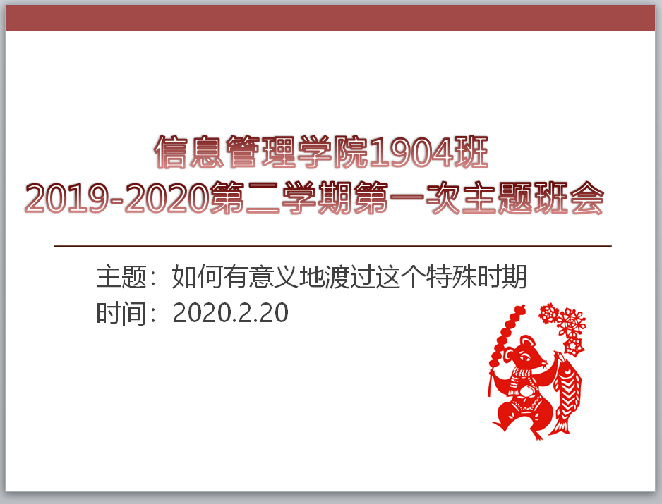 受到新型冠状病毒疫情影响武汉,全国各地高校推迟开学时间,疫情当前,作为华中师范大学大学的大一学生们,在为武汉加油的同时,寒假期间在家积极进行学习与锻炼,提升自我技能。因此此次班会以“如何有意义的度过特殊时期”为主题,同学们利用QQ群聊在线共享投屏功能,通过PPT是分享和讨论的疫情期间的身心状况,自我学习情况和进度规划。