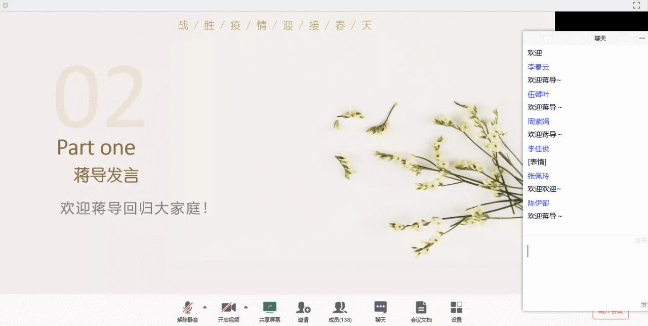 最后,蒋导提到,一场疫情让我们所有人都面临一堂人生大课,同学们要珍惜每一天及感恩守护我们平安的人。天佑中华,在这特殊时期,大家齐心协力,共克时艰,相信我们在不久的将来就可以重聚桂子山。