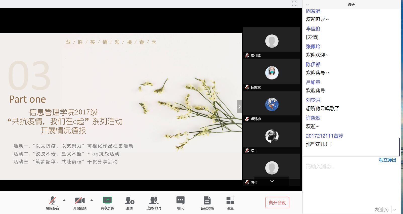 蒋导发言后,年级主席武晓红开始通报2017级“共抗疫情,我们在e起”系列活动的进展情况,主要包括与疫情相关的作品征集活动、flag挑战活动、和收集各专业同学疑问、困惑的解答情况。她表示在同学们积极配合和老师们的耐心指导下,各项工作进展顺利。