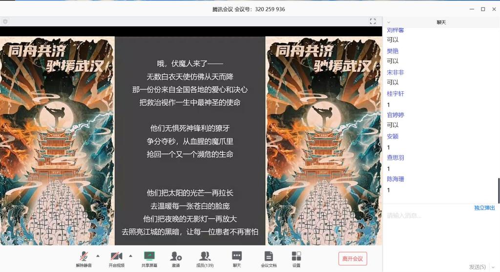 接下来是主题教育小组展示环节,年级同学一共分成了十二个小组,以“人民战‘疫’共克时艰”为主题进行作品展示。各组同学通过视频拍摄、制作海报、绘画、诗歌朗诵、文字写作等形式表达当代大学生对新型冠状病毒感染的肺炎疫情阻击战的思考。