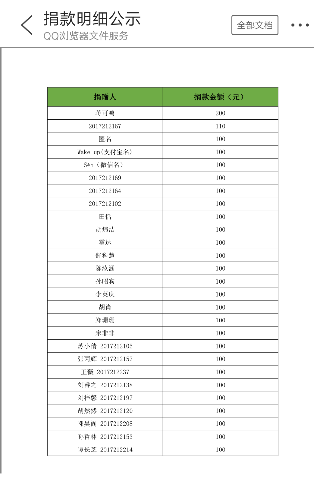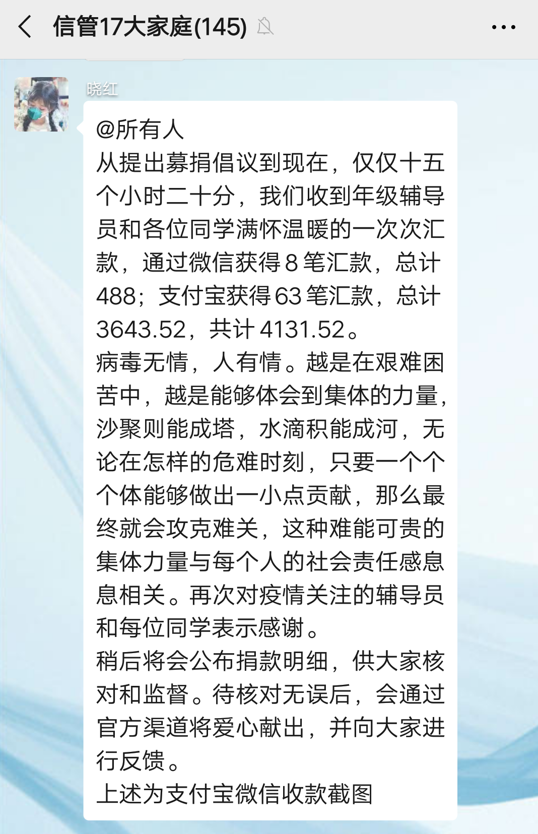 此次爱心募捐完全自愿,信息管理学院2017级全体成员用自己的实际行动积极为战斗在一线的“逆行者”家庭和因疫情致困家庭送去温暖,鼓劲加油,尽一份绵薄之力。