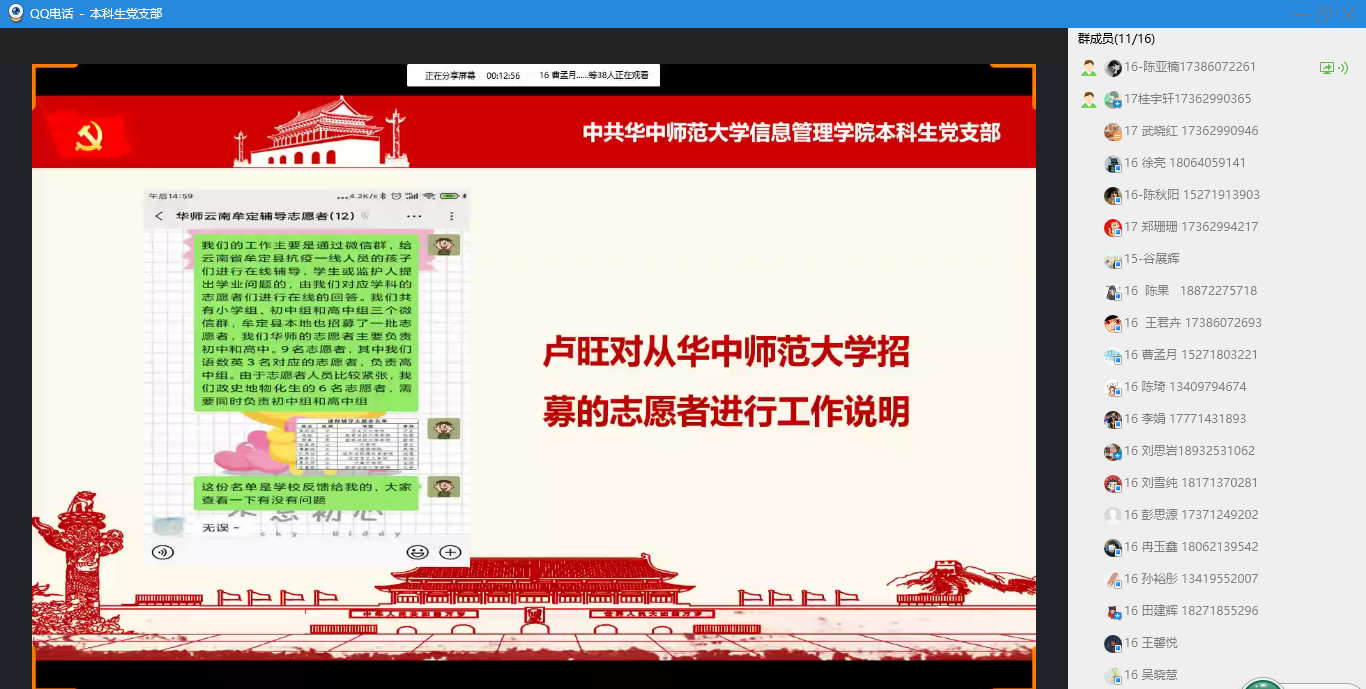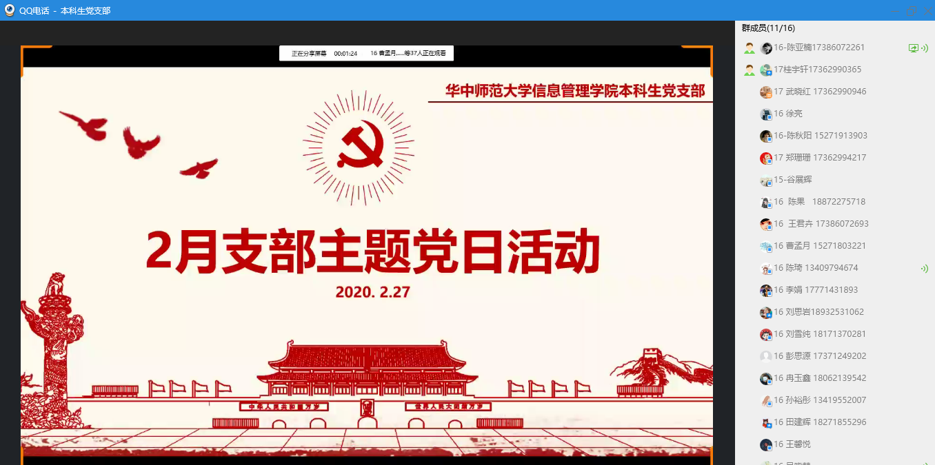 (通讯员 武晓红)2020年2月27日上午十点,中共华中师范大学信息管理学院本科生党支部二月主题党日活动顺利召开。由于疫情的特殊原因,支部成员通过线上的形式开展了这次特殊的党日活动。本科生党支部书记肖丽霞出席本次活动,支部副书记陈亚楠同志主持。
