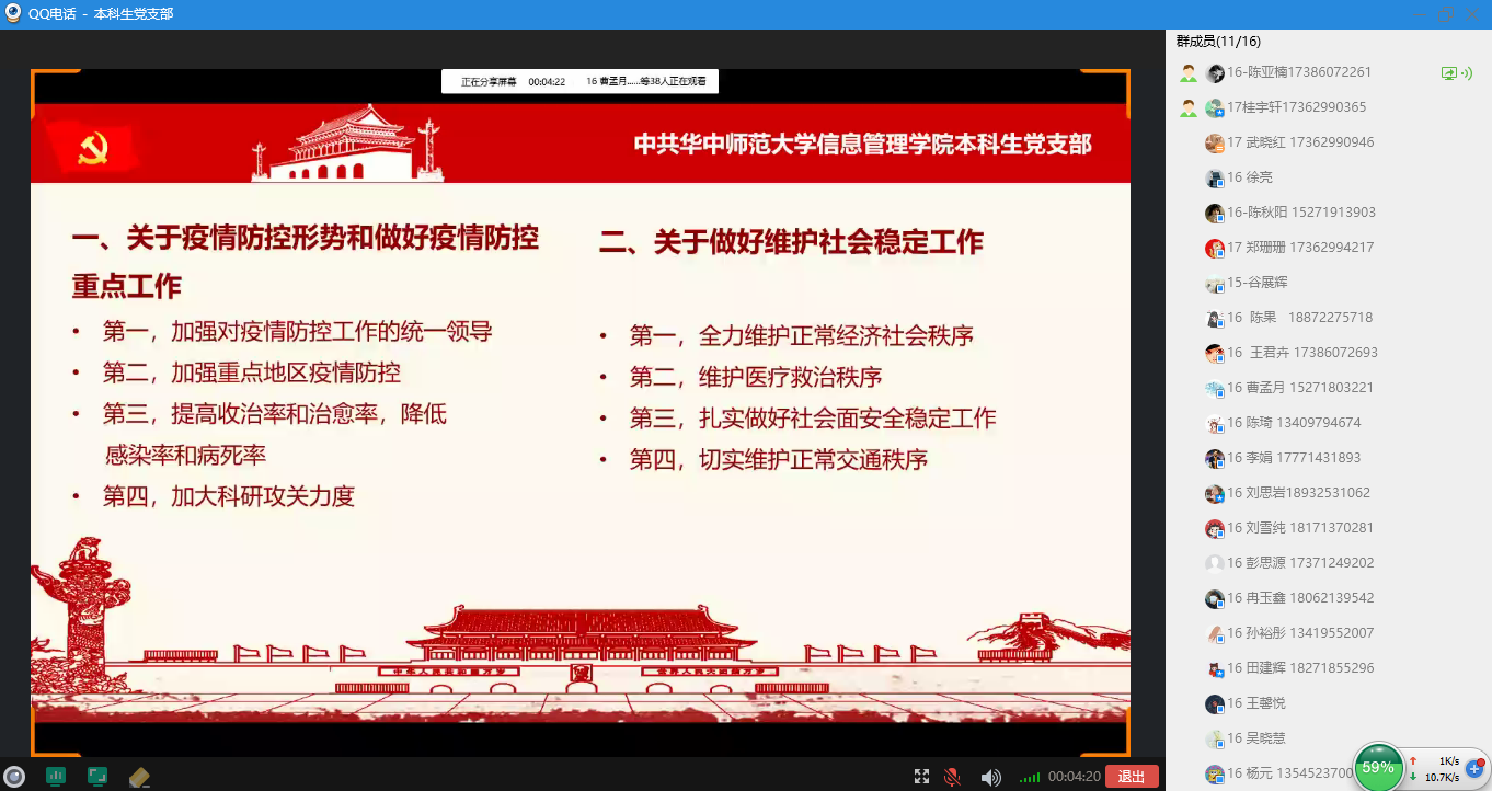 疫情就是命令,防控就是责任,全体党员同志围绕习近平总书记关于疫情防控的重要指示精神,展开线上统一学习。本次学习共分四大板块。会议伊始,陈亚楠同志通过概括梳理,分条为大家进行内容讲解。在陈亚楠同志的带领下,支部党员同志集中学习了习近平总书记在中央政治局常委会会议研究应对新型冠状病毒肺炎疫情工作时的讲话。陈亚楠同志谈到,作为党员我们应该做好疫情宣传教育和舆论引导,面对网络上众多的信息,我们党员同志应该不信谣不传谣,把握主导方向,弘扬正能量,以乐观积极的态度面对疫情,坚定战胜疫情的信心,充分发挥党员的模范带头作用。