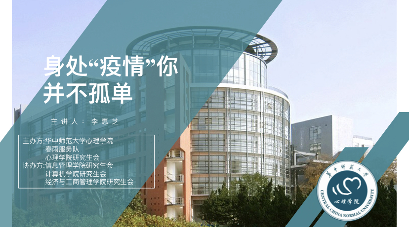 (通讯员 张文林)新型冠状病毒感染的肺炎疫情牵动着全国人民的心,目前国内疫情已经得到有效控制,但全球确诊病例仍旧在急剧攀升,伴随着各项数字的增长和“封闭式管理”,在无形中加大了人们的心理压力。针对疫情可能对我校师生造成心理影响的问题,由华中师范大学心理学院、春雨服务队以及心理学院研究生会主办,信息管理学院研究生会、计算机学院研究生会以及经济与工商管理学院研究生会协办的一场以“联心抗疫,e路相伴:身处疫情,你并不孤单”为主题的线上讲座于3月20日晚8点30准时进行。