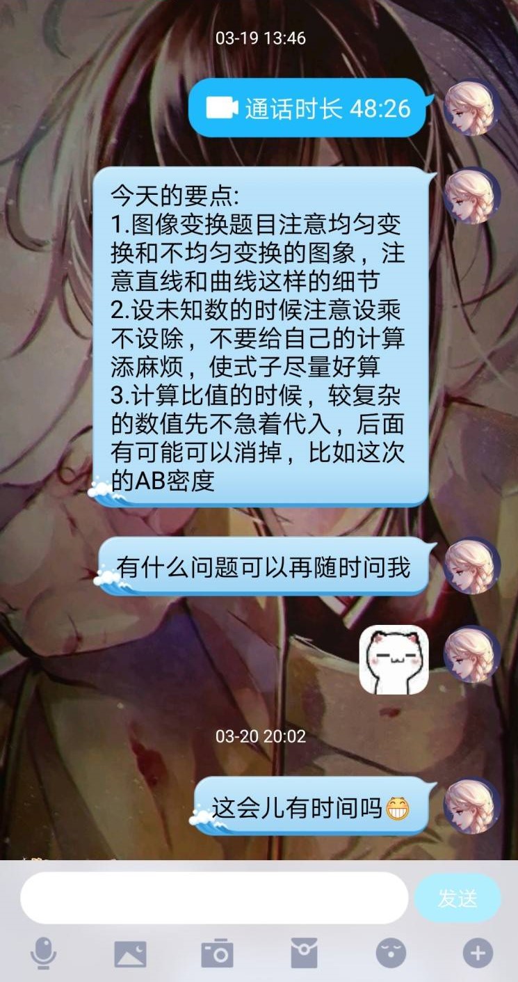 志愿者夏春秋和志愿者谢双蔓同样是在对初二学生小易近期的学习能力以及学习情况分析过之后,于上周为他制定了今后的辅导计划。由于数学中图像比较多,所以志愿者夏春秋和志愿者谢双蔓都采用屏幕分享的形式辅导小易。在上一周,志愿者夏春秋主要是辅导小易图像变换部分,结合小易做的相关练习题的情况,志愿者夏春秋将图像变换题目的注意要点以及小易容易出错的部分整理成文字形式以QQ消息的形式发送给他,这样便于小易查漏补缺。考虑到初二数学中几何内容最为重要,同时小易的学习进度相对较快,于是志愿者谢双蔓为小易挑选出一些有关几何的常考题型和难题进行针对性训练,帮助他打好几何基础。
