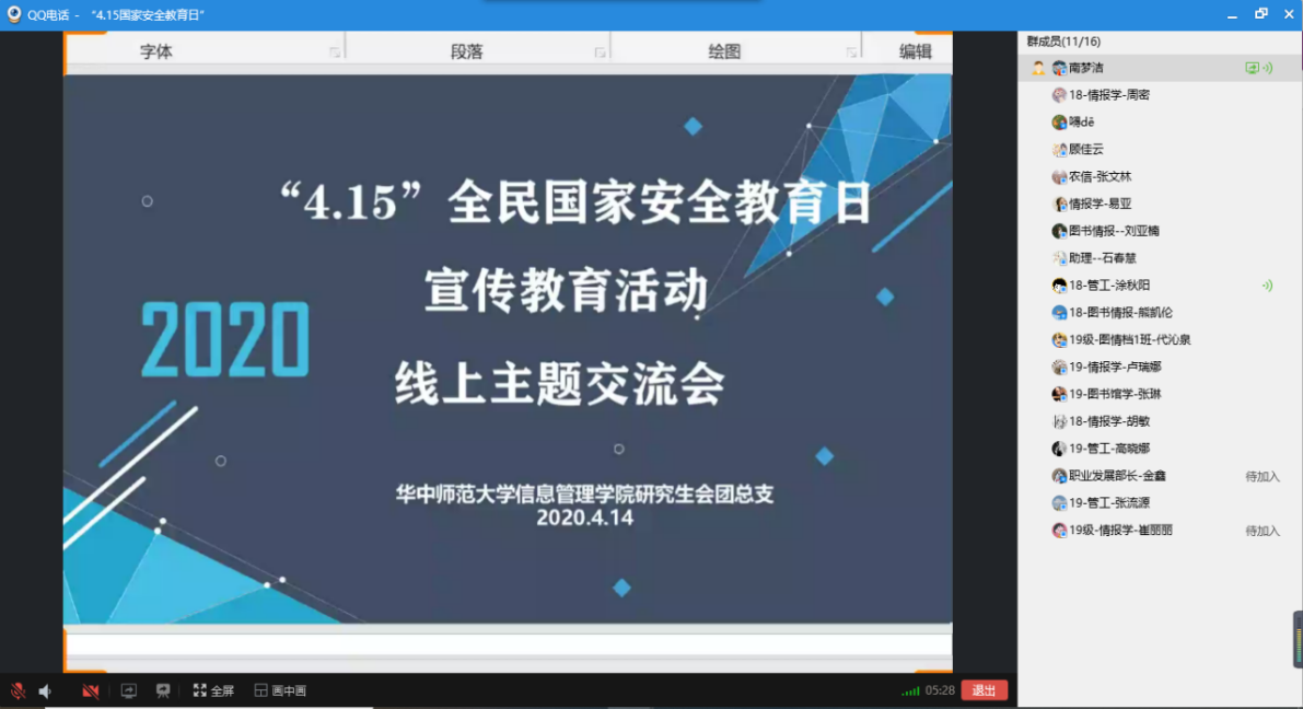 组织学习讨论,强化安全意识。为贯彻落实习近平总书记重要指示精神,深入学习总书记全面依法治国新理念新思想新战略和坚持总体国家安全观的重要论述,提高全民国家安全法治意识,我院举行了线上会议,通过以班级为单位的主题“云”班会及在线党团学习等形式,组织学生分享和讨论自己的心得以及在新冠疫情期间的所闻所见。在主题交流活动中,2018级管工团支书王钦结合疫情谈及个人感想,“疫情期间,发生了许多可歌可泣的事迹,涌现了一大批舍身忘己的优秀党员和群众,我们应当向他们看齐,学习他们敢为人先、不惧危险的精神。这既考验着责任和担当,也考验着素养和能力。在面对危机的时候,信心和勇气也是强大的力量源泉。”同时,本次交流活动还紧紧围绕当前新型冠状病毒这一公共卫生事件所反映出的生物安全与公共卫生安全问题进行了充分的讨论。2018级情报、档案学团支书张展豪进一步表示:“通过此次活动同学们增强了对于国家安全法、网络安全、生物安全,公共卫生安全等涉国家安全法律法规和国家安全知识的了解,提升了国家安全意识。同时也增强了同学们尊法学法守法用法、维护国家安全的自觉性。”