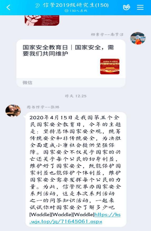 开展宣传活动,增强学习信念。“国家安全”与我们每个人的生活都有关,小到随口一句话、拍张照片、搜集网络公开的资料等等。为了增强学生对国家信息安全的学习意识,我院官方公众号“CCNU信管研究生”于4月15日推出了关于“4.15全民国家安全日”知识普及的推文,把主题宣传教育活动贯穿到日常思想政治教育工作中,引导同学们增强对相关内容的了解。
