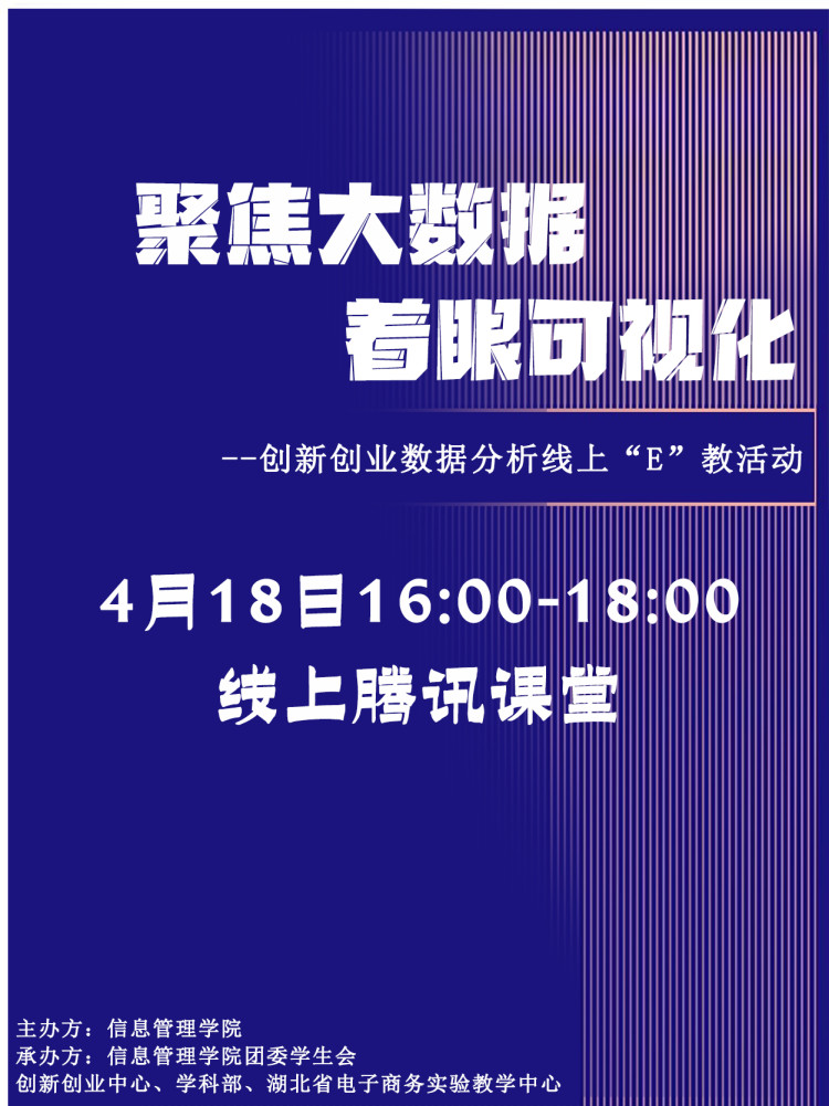 (通讯员 徐琳琳)4月18日晚,“聚焦大数据,着眼可视化” ——创新创业数据分析线上“e”教活动第三期在腾讯课堂顺利举行。本次活动由信息管理学院主办,华中师范大学信息管理学院团委学生会创新创业中心及学术科研部、湖北省电子商务实验教学中心承办,信息管理学院教师王丹担任主讲。