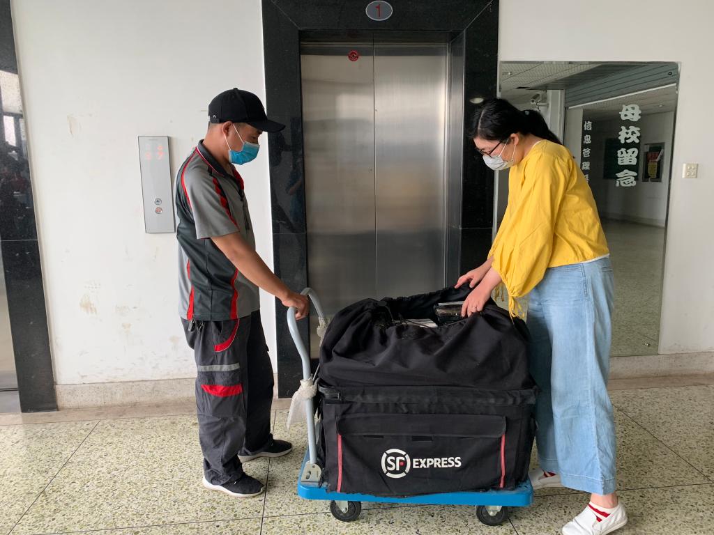 小心翼翼的“发货员”。所有寄送物品打包完成后,通知快递小哥上门取货发货。与快递小哥做好沟通强调,特别是书籍、电脑等物品的分装分拣,哪些物品不能压,哪些需要保价,哪些物品学生强调了额外包装……因数量较大,快递小哥在辅导员老师们的帮助下,借用推车装货搬运,来回跑了两趟才得以完成。整个过程谨慎细致,确保物品能完好无损地寄送到学生手中,并在物品发货后迅速通知学生注意查收快递。