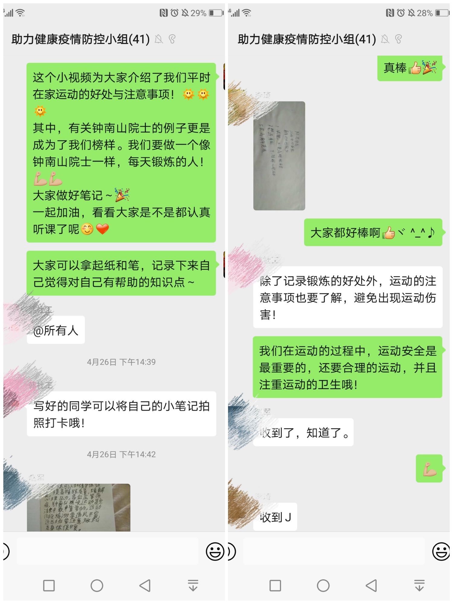 活动之初,首先由志愿者褚予汐向徐家棚的学员们介绍体育锻炼的好处,并列举了84岁钟南山院士长期坚持运动的事例来向学员们展示体育锻炼的重要性。之后,志愿者又向学员们介绍了在运动时的几个注意事项。学员们纷纷记下笔记,拍照上传至微信群内打卡。