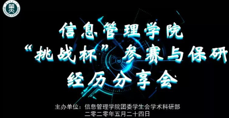 (通讯员  徐琳琳)5月24日晚,信息管理学院在线上成功举办信息管理学院“挑战杯”参赛与保研经历分享会。信息管理学院2016级本科毕业生张孜铭、孙裕彤、陈秋阳、刘思岩、王馨悦以及17级舒科慧六位同学依次介绍在大学期间参赛或保研的经历,17级辅导员蒋可鸣出席本次分享会,活动由19级李琳同学主持。