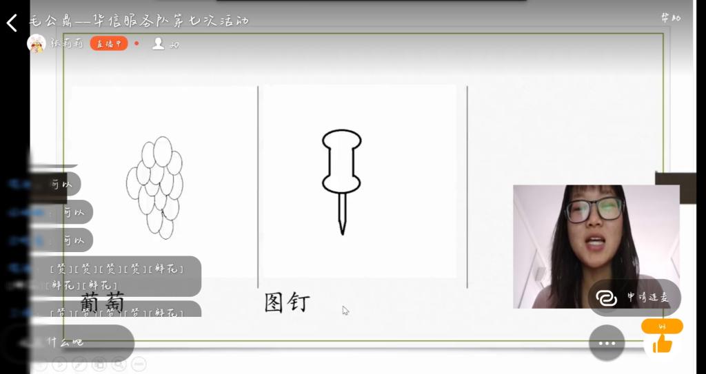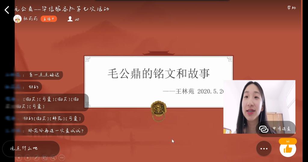 志愿者刘灿同残疾人朋友分享了毛公鼎在历史、文化、书法方面的价值,同时以视频的形式进一步深化了毛公鼎的文物价值。志愿者兰子银选择以不同人物动画图片配以相应通俗文字的形式介绍毛公鼎的历史流传过程。从毛公鼎的出土现世到毛公鼎的初次买卖再到毛公鼎的流传过程,残疾人朋友都听得不亦乐乎,纷纷在讨论区留言称赞。志愿者王林苑负责介绍毛公鼎的铭文和故事,志愿者王林苑在展示完毕毛公鼎的铭文内容后,对铭文的内容做了详细的介绍,并在最后阐述了毛公的有关历史记载。