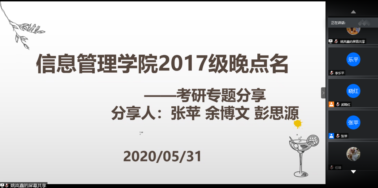 (通讯员 李乐平)5月31日晚19:30,信息管理学院17级利用晚点名的时间,邀请到3位16级考研成功的学长、学姐为大家分享考研经验,帮助大家找到方法,坚定信念。会议由年级副主席姚岚鑫主持,辅导员蒋可鸣和全体17级学生参会。