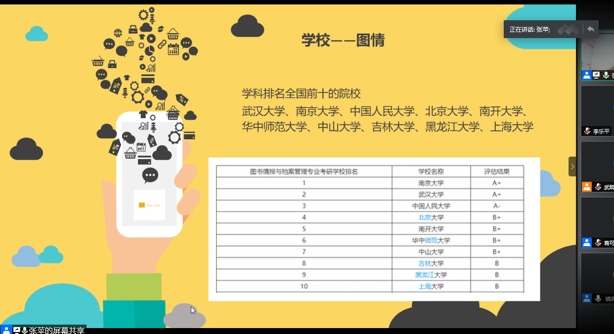 最后,以总成绩第一被我院情报学录取的彭思源学姐在分享中谈到,在备考过程中,要不断提升自己背诵记忆的能力,尽可能达到准确、全面、系统的程度,不错过每一个知识点。同时她还向同学们分析了面试的相关情况,总结了一些面试过程中可能出现的问题,和答题技巧。最后她强调了结伴学习的重要性,鼓励大家团结、合作学习。