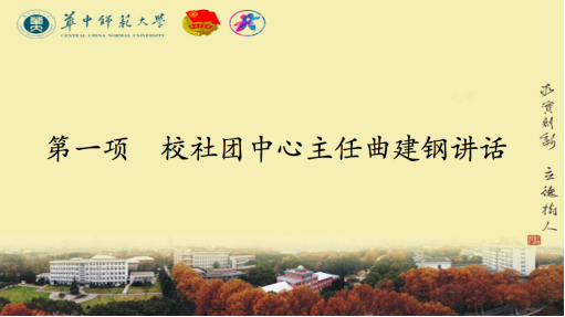 社团指导中心主任曲建钢做开班致辞。曲建钢向“薪火计划”培训班班成员介绍了学生社团指导中心的概况与性质。他强调,在学校团委的支持下,在各社联人与协会负责人的努力下,学生社团发展日益壮大,同时社团工作者的重要性也变得愈加突出。社团工作者作为社团发展的助力者,在社团文化日益繁荣的今天,更应该提高自身素养,学习前辈的工作理念、工作经验,借着社团指导中心改革的春风,更好地助力学生社团发展。最后,曲建钢表达了对“薪火计划”成员的期望:“希望大家在这次培训中学有所成,提升自己的思想政治水平,提升工作能力,助力学生社团的发展,做社团工作的接班人。”
