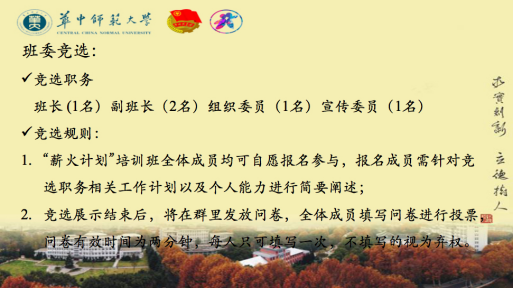 班长竞选演讲结束后,接下来依次为副班长、组织委员以及宣传委员职位的竞选。竞选者们依次发表演讲,从个人素质,思想面貌,学习情况,工作经历等依次向众人介绍自己的优势。