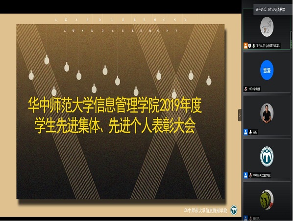 (通讯员 李雪漫)6月17日下午,信息管理学院2019年度学生先进集体、先进个人表彰大会在腾讯会议平台如期举行。本次大会综合表彰2019年度“信管之星”领军奖的优秀团队及个人,2019年度共青团工作先进集体及先进个人,2019年度国家奖学金及校长奖获奖者。大会邀请到了07届优秀校友、深圳乐其网络科技有限公司董事长周阳先生作为嘉宾。出席大会的有信息管理学院院长李玉海,副院长卢新元,副院长曹高辉,院工会主席胡潜,教师代表和全体辅导员。大会由党委副书记王涛主持。
