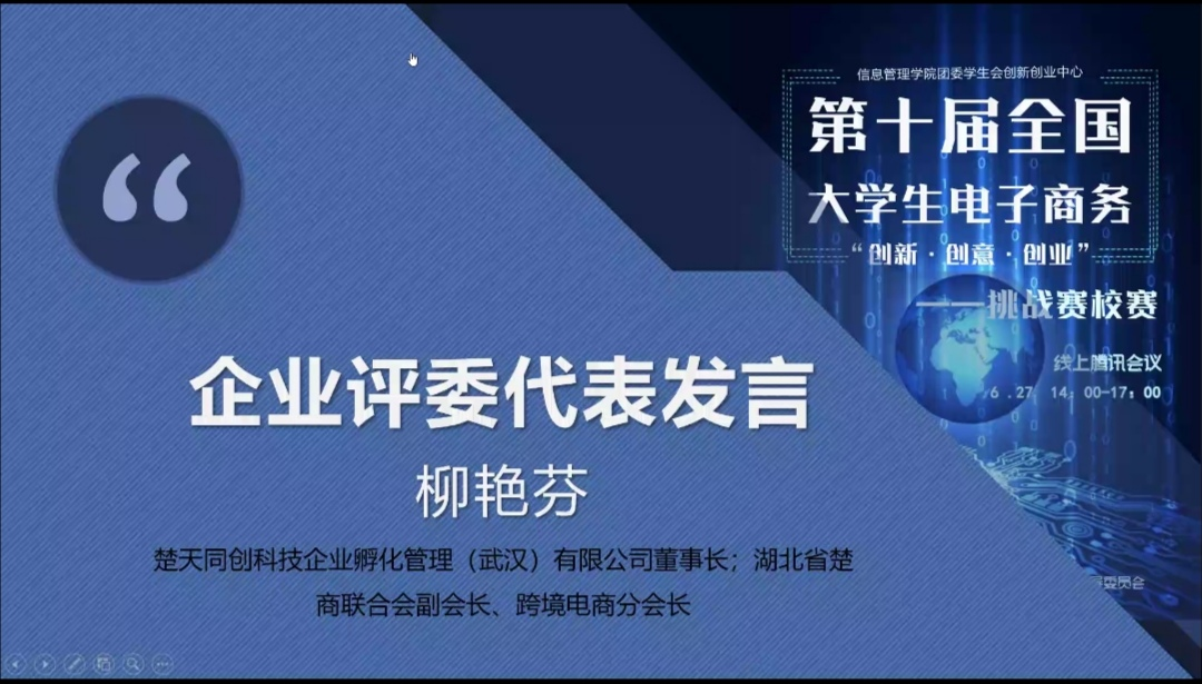 (通讯员 石丹)6月27日下午,第十届全国大学生电子商务“创新·创意·创业”挑战赛湖北赛区华中师范大学校级选拔赛在腾讯会议举行。出席本次比赛的评委有华中师范大学老师段钊、谭春辉、胡伟雄、肖毅、程秀峰、陈慧、王光超、王萍、曾江峰,莅临现场的企业评委有深圳市玺承文化传播有限公司华中大区总经理曾军容、十堰土拨鼠科技网络有限公司经理吴晓辉、武汉云客电子商务股份有限公司总经理黄鹏、神州数码总经理金佳、北省电子商务行业协会会长闫顺山和楚天同创科技企业孵化管理(武汉)有限公司董事长、湖北省楚商联合会副会长、跨境电商分会长柳艳芬。