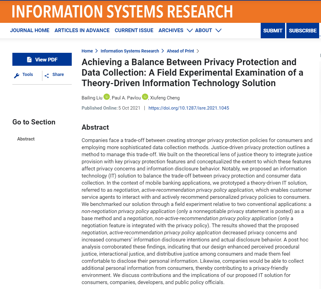 (通讯员 曹高辉)近日,华中师范大学信息管理学院刘百灵副教授、美国休斯敦大学Bauer商学院Paul A. Pavlou杰出讲席教授、华中师范大学信息管理学院程秀峰副教授合作完成的研究成果——《Achieving a Balance Between Privacy Protection and Data Collection: A Field Experimental Examination of a Theory-Driven Information Technology Solution》在Information Systems Research发表。