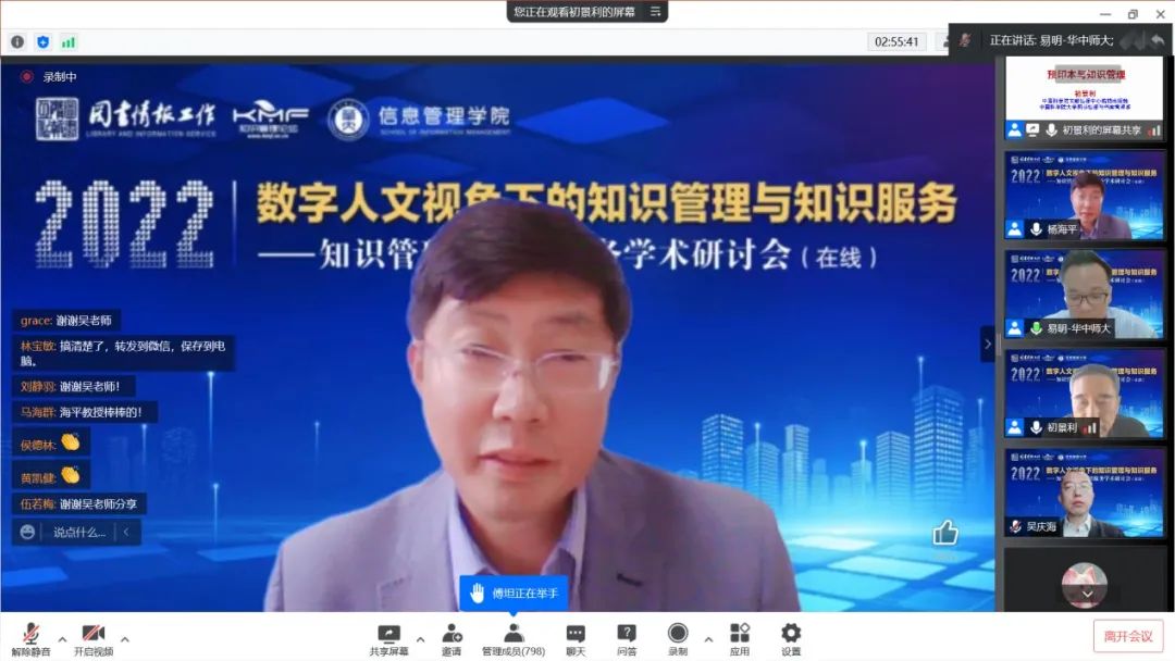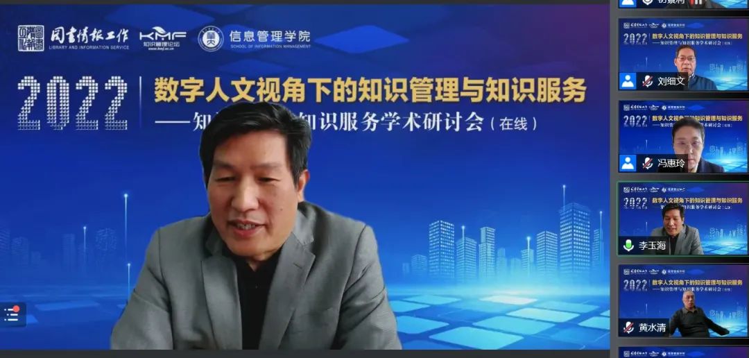 为探究大数据、云计算、人工智能等技术对知识管理与知识服务的影响,积极推动新文科建设、数字人文领域背景下知识管理与服务的快速发展,由《图书情报工作》杂志社、《知识管理论坛》编辑部与华中师范大学信息管理学院联合主办,行者互联科技(北京)有限公司、国家新闻出版署智慧出版与知识服务重点实验室、广州奥凯信息咨询有限公司协办的“2022知识管理与知识服务学术研讨会”于2022年5月13日在线召开。从事数字人文及知识管理与知识服务相关研究和实践的专家学者,共同分享了数字人文及知识管理与服务的实践进展与最新学术成果。在线人数达1 500余人。
